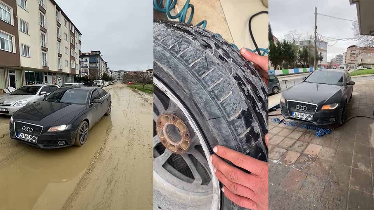 Otomobil, lastikçiye çekildi ve yeni lastik takıldı. Sürücüler, yoların biran önce asfaltlanmasını istiyor