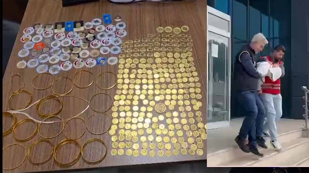 Şüpheli üzerinde yapılan aramada; 216 adet çeyrek altın, 15 adet yarım altın, 47 adet ata lira, 4 adet kulplu tam altın, 1 adet beşi bir yerde altın, 56 adet 1 gram paketli altın, 1 adet 0,5 gram altın, 2 adet toplam 20 gram paketli altın,16 adet farklı ağırlıklarda altın bilezik,1 adet altın kolye,1 adet altın bileklik ele geçirilmiş olup müştekiye teslim edilmek üzere muhafaza altına alındı.