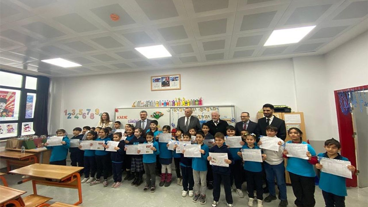 Kaymakam Günlü ve Arslan, 2025-2026 eğitim ve öğretim yılında kapılarını açan Mehmet Akif Ersoy İlkokulu’nda sınıfları dolayarak öğrencilere karnelerini takdim etti, hediyeler verdi.